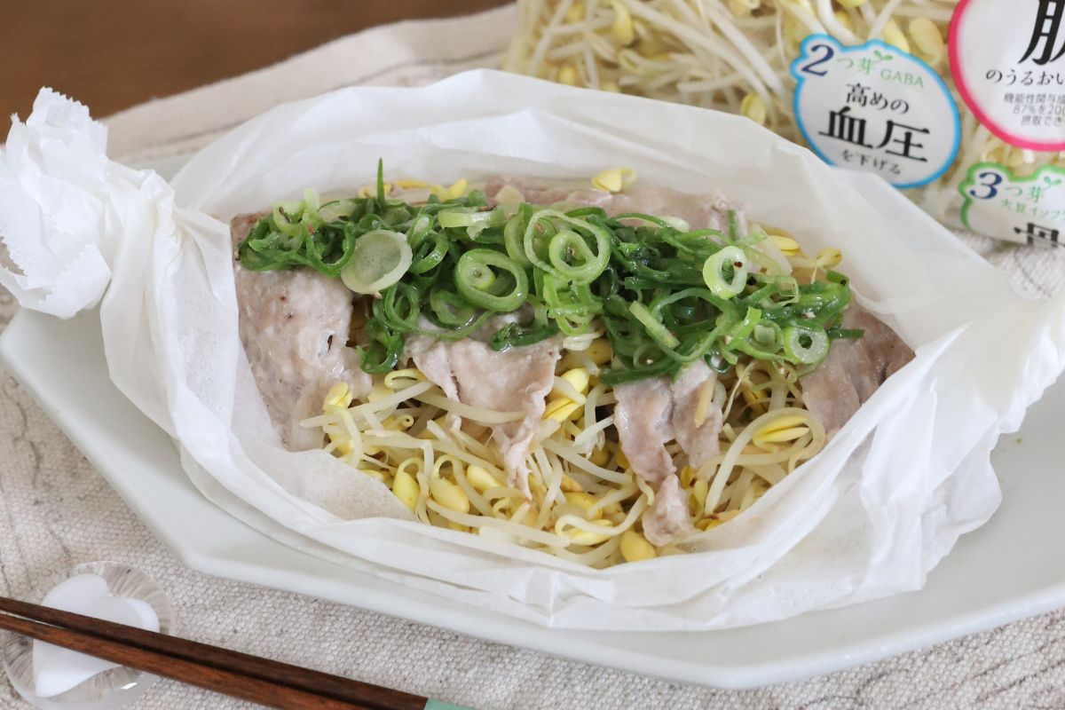 - 耐熱皿にクッキングシートを敷き、子大豆もやし 芽ぐみをのせる。もやしの上に、豚肉を重ならないように広げて並べる。