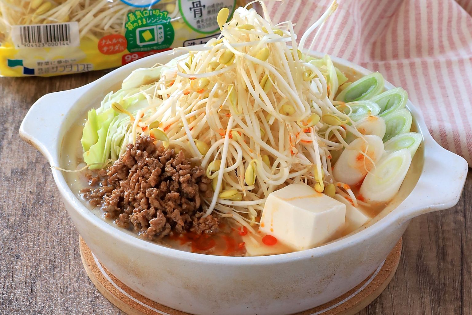- 鍋に<A調味料>を全て入れて溶き合わせ、子大豆もやし 芽ぐみを盛り、②、キャベツ、長ねぎ、絹豆腐を加えて火にかける。