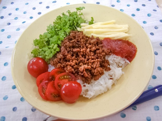 熱々をお皿の上で混ぜて食べるのが楽しい、タコライス。