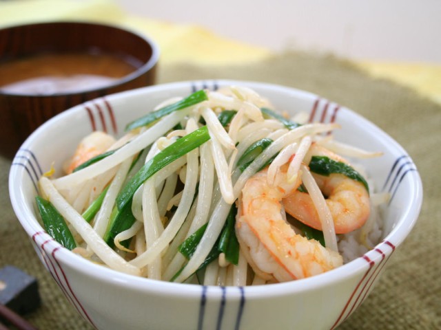 野菜たっぷりビビンバ丼。子大豆もやしの食感がたまらない!