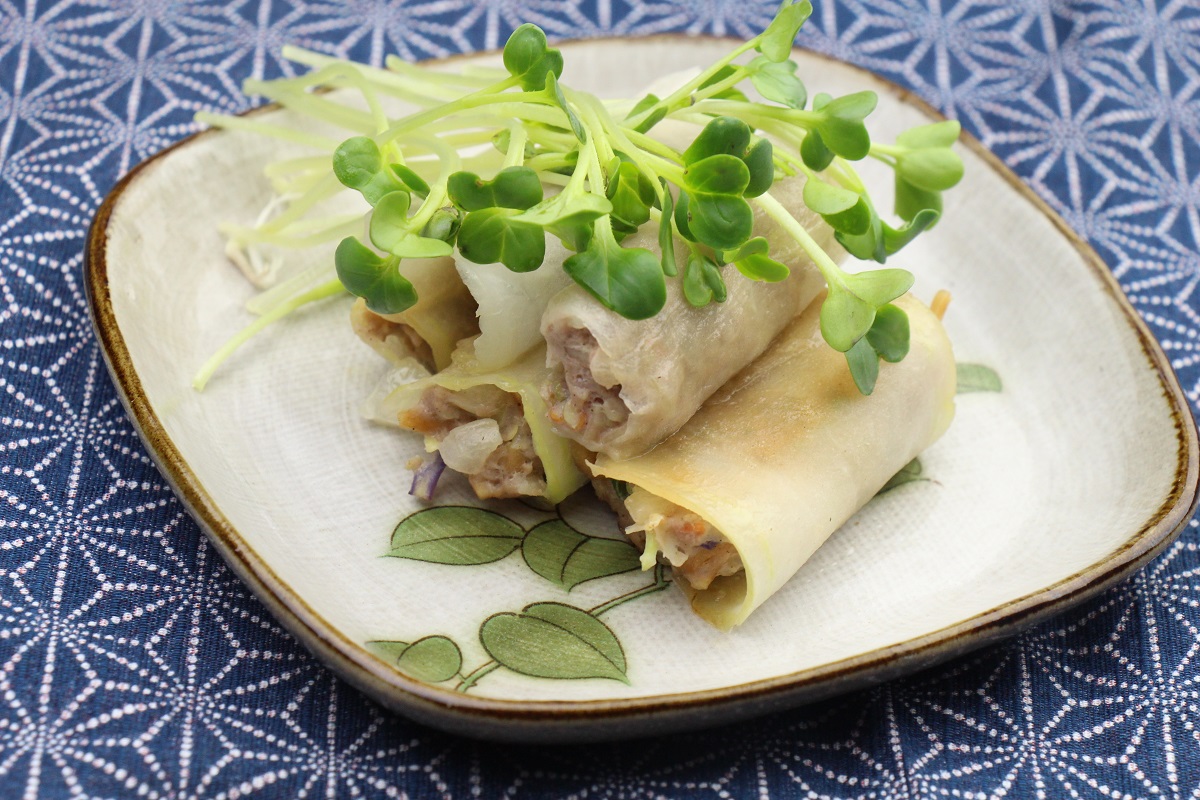 - 粘り気が出てきたら、スライス大根の上に餡を乗せ、巻き、サラダ油を入れ、熱したフライパンでこんがり焦げ目が付くぐらいに焼きます。(皮の切れ目を下にして焼くとGOOD!)