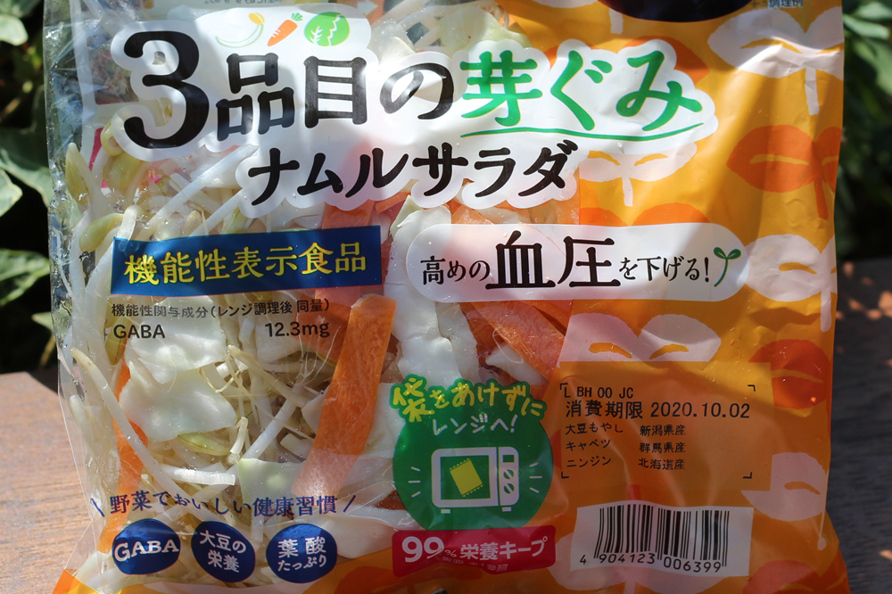 「野菜増し袋」は袋のまま電子レンジで2分間加熱。インスタントラーメンに乗せるだけで、1日に必要な野菜量350gのうち1/3の120gを摂ることができます。