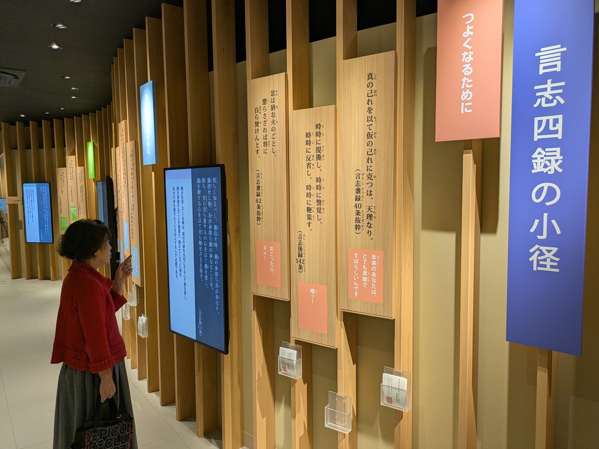 面白いのは「対話式コトバ診断」のコーナーです。あなたへ一斎先生から質問があり、その答えによって、今のあなたにふさわしい言志四録の言葉が伝えられます。あなたの新しい気づきになるかもしれません。いろいろな一斎の言葉が降り注ぎ、一斎の考え方が体感できるミニシアターもあります。
