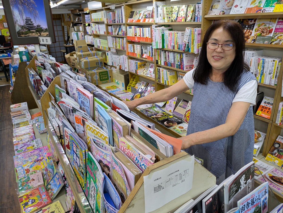 昭和の初めに創業し、間もなく100年。昔は雑貨や駄菓子も売り、印刷業までしていたとか。書店専業の今はこじんまりした店内に、雑誌から単行本、学習参考書、郷土出版物までびっしり。自費出版本や同人誌も置いています。学校や一般家庭に配達もして、しっかりと地域に根づく老舗です。