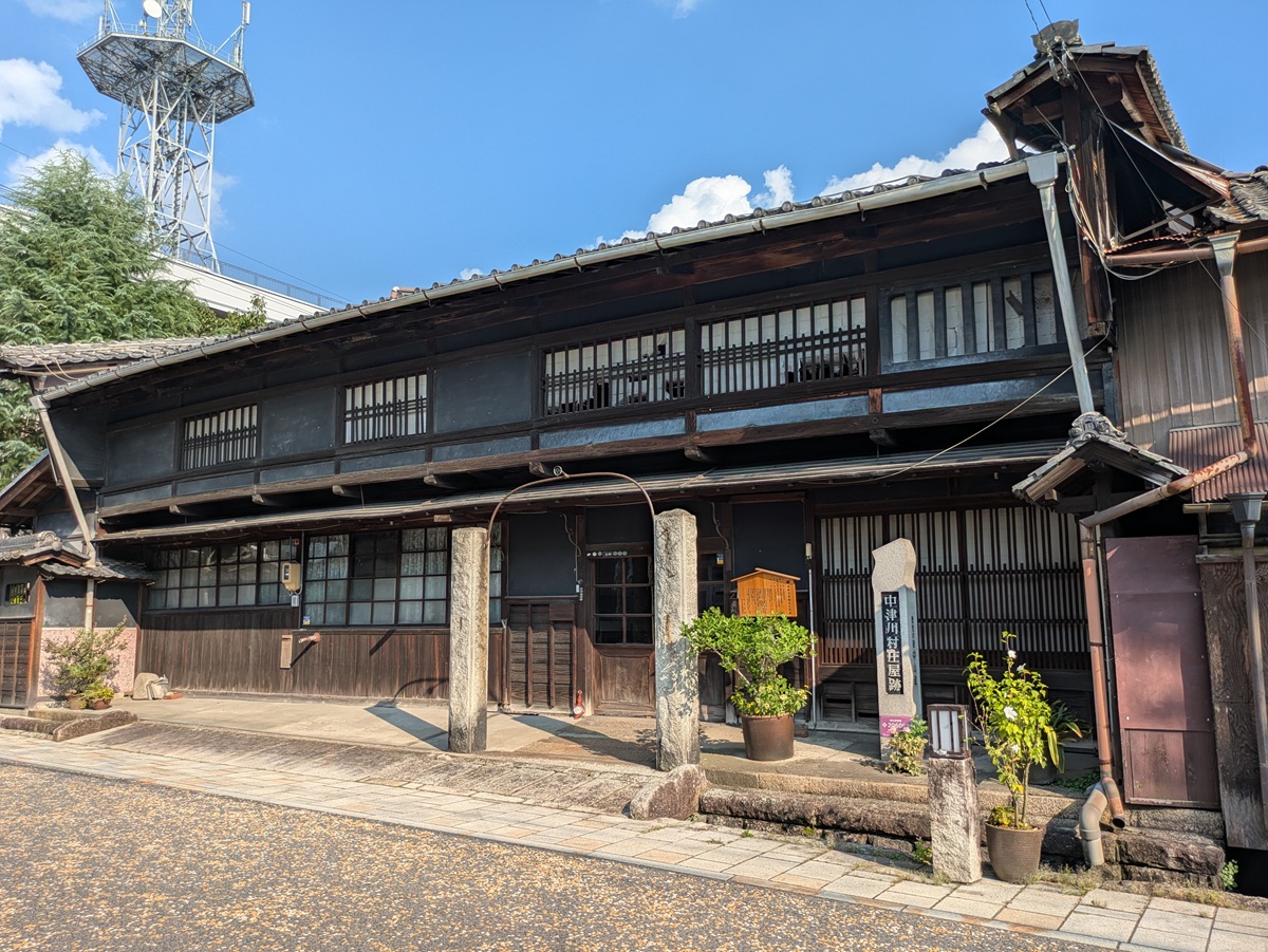 2階建ての大型町屋建築です。正面の間口は15・5メートル、奥行きは22・8メートル。敷地の間口は20メートル近く。建築年代は不明ですが、基本構造は江戸中期にさかのぼり、庭は古木と石、池が配されています。庄屋を務めながら旅籠(はたご)も営み、各地の殿様や明治維新を担った要人も東西を行き来するなかで宿泊しました。