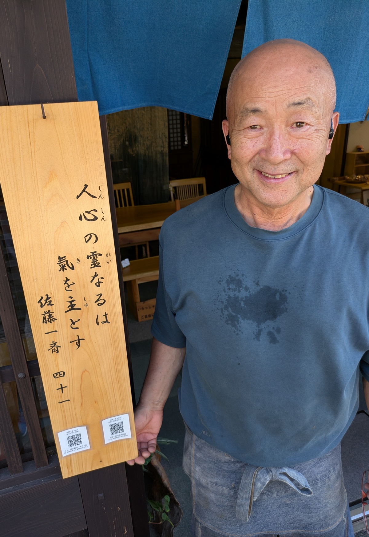 写真:「人心の霊なるは……」の名言札と、ご主人の松井さん=恵那市岩村町