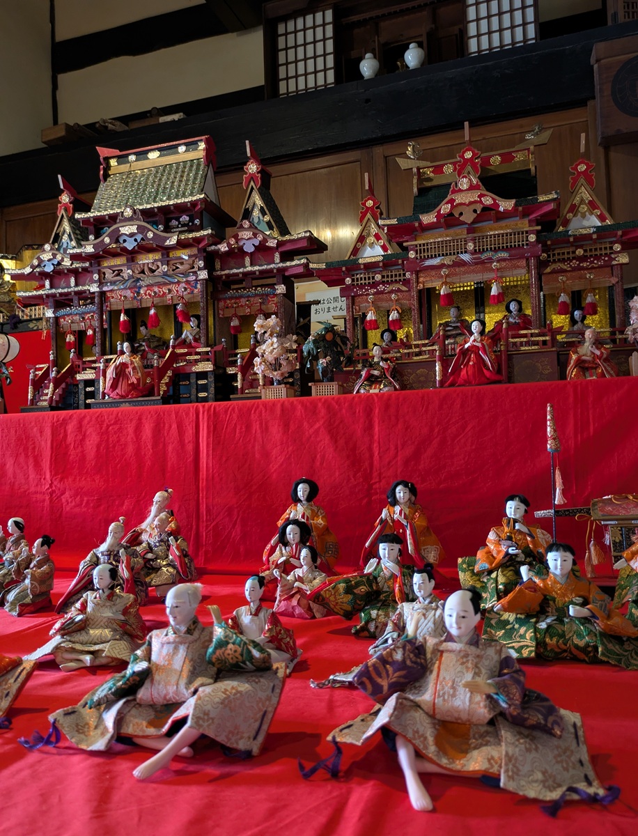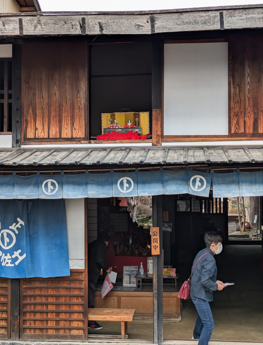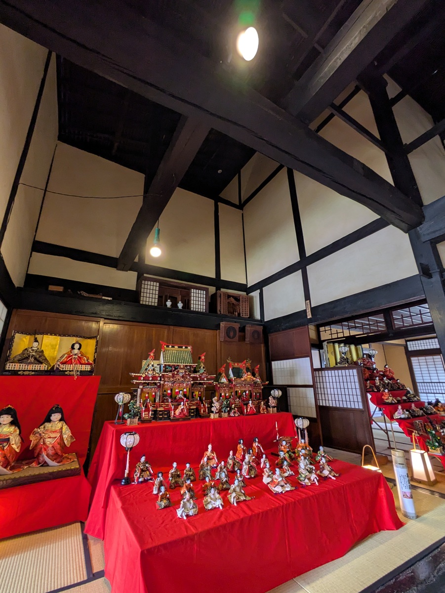 「土佐屋」の屋号で染め物業を営み、明治以後は金融も担った河合家。こちらには段飾りがいくつも置かれています。圧巻は、太い梁(はり)が渡された吹き抜けの居間の堂々たる「御殿飾り」。「昭和」の戦後復興期のものだそうです。奥の土蔵には、色鮮やかなひなの掛け軸も並んでいます。