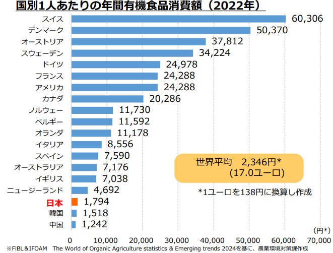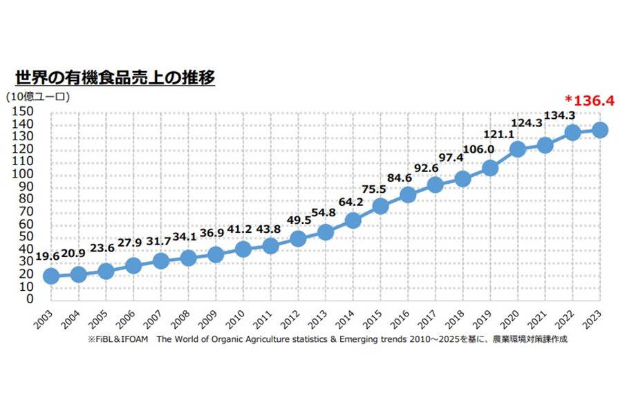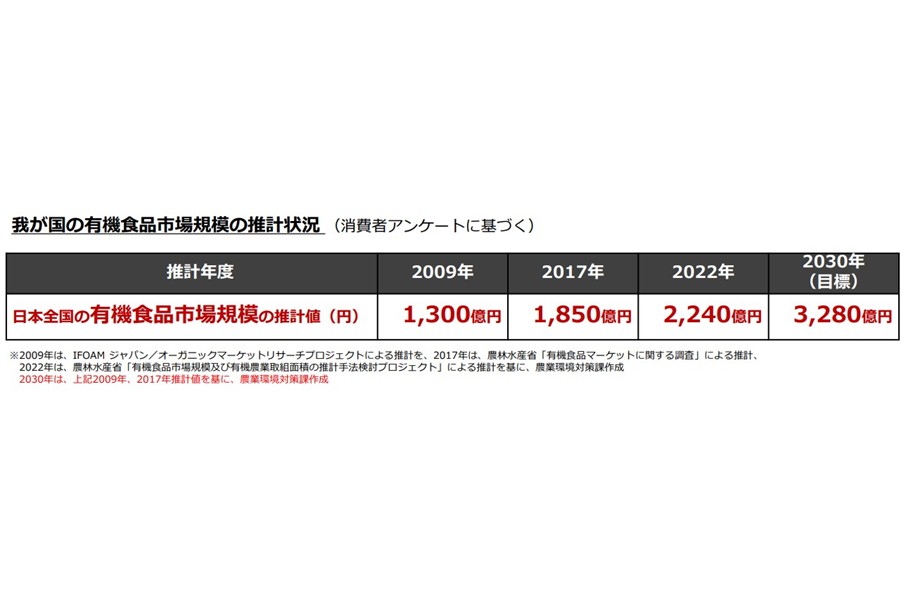 2025年に公開された農林水産省の報告によると、世界を見れば有機食品の市場は北欧諸国を中心に拡大を続けています(図1)。一方で日本は、有機食品を意識的に利用している方は半数未満で、消費額を見ても世界平均以下となっており、まだまだ市場が伸びる可能性を秘めております(図2, 3)。現に、農林水産省の調査では、2009年以降日本全国の有機食品市場規模は拡大を続けており、2030年には3,000億円を超える市場規模にすることが目標として掲げられています(図4)。