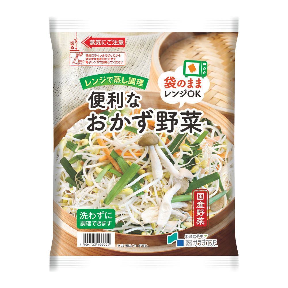 今回販売する「便利なおかず野菜」は、2024年に販売していたものを中身、パッケージとも見直しました。小松菜の代わりにニラを採用し、子大豆もやし、にんじん、ぶなしめじ、ニラの4種の野菜を配合しています。また、パッケージはせいろをイメージしたデザインへと変更しました。本商品は、袋のまま電子レンジ調理ができるパッケージ素材を採用しております。近年、せいろを使った調理が注目を集める中、袋のまま電子レンジで調理することでせいろのような蒸し調理を、せいろをお持ちでない方でも手軽に実現することができます。