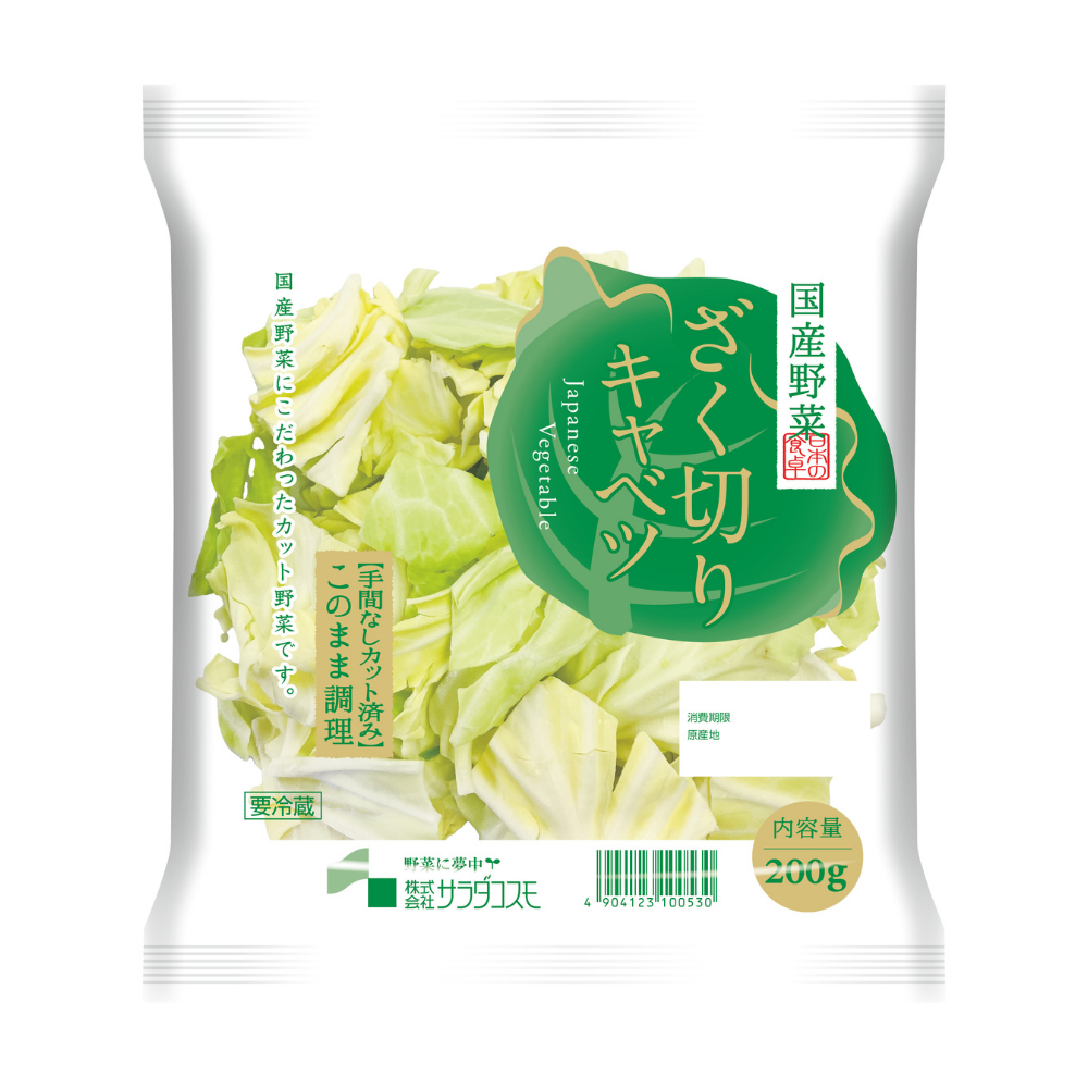 国産キャベツをざくっと切ったカットキャベツ。炒め物に使いやすいよう丁度いい大きさにカットしてあり、洗わずそのままお使いいただけます。