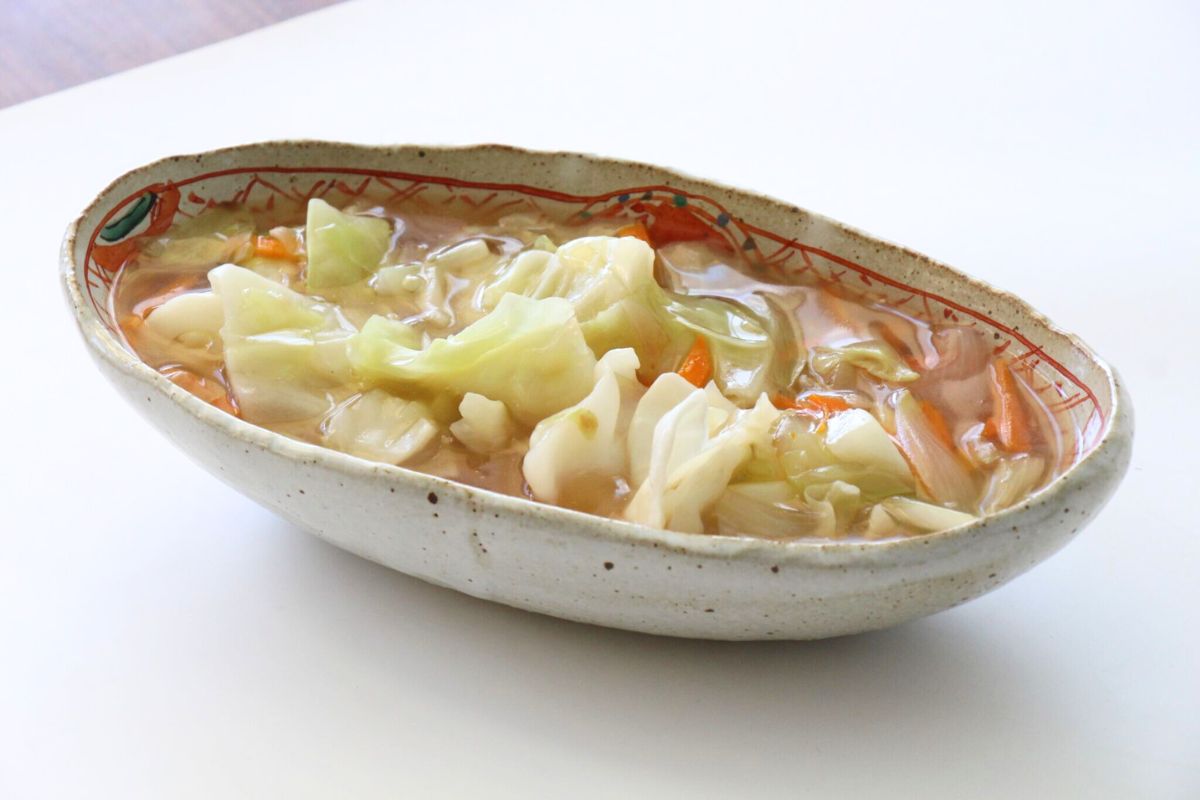 - 水溶き片栗粉(●)を回し入れ、よく混ぜ、とろみをつけたら完成です。
