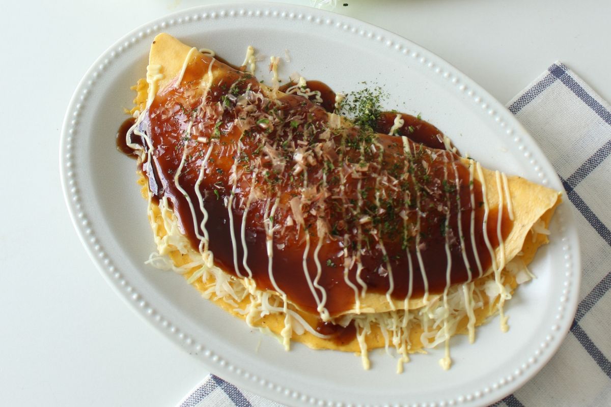 - 二つに折り畳んで器に盛り、お好み焼きソース、マヨネーズ、かつおぶし、青のりを乗せる。