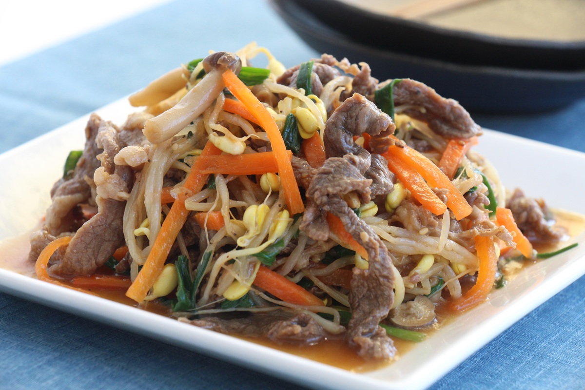 - 牛肉に火が通ったら、①の野菜、鶏ガラスープの素、残りの焼肉のタレ(大さじ2)を加え、全体をよく混ぜます。全体に馴染んだら完成です。