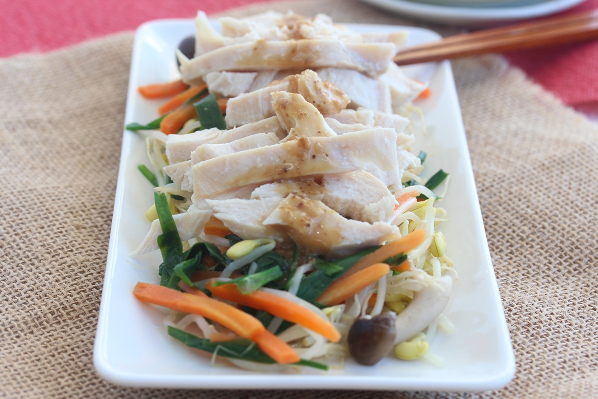 - 器に、③の野菜を盛り、食べやすく切った鶏むね肉をのせ、ごまダレをかけたら完成です。