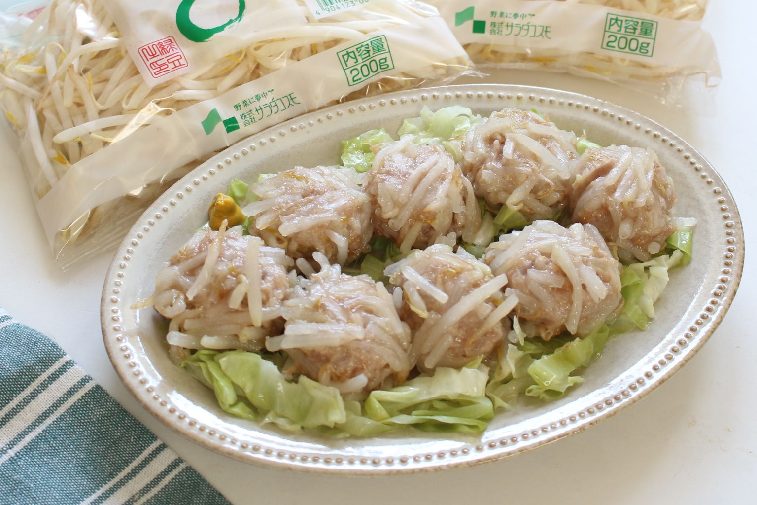 - キャベツは5mm幅の細切りにして耐熱皿に敷き、⑤のシュウマイを間隔を開けて並べ、ふんわりとラップをして電子レンジ600Wで7分加熱し、そのまま3分蒸らす。