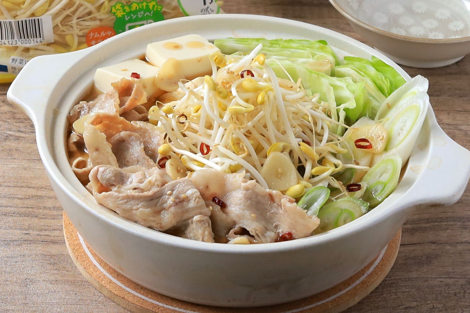 - 鍋に水、ごま油、顆粒鶏がらスープ、しょうゆを入れて溶き合わせ、②、「子大豆もやし 芽ぐみ」、キャベツ、長ねぎ、絹豆腐を加え、蓋をして火にかける。