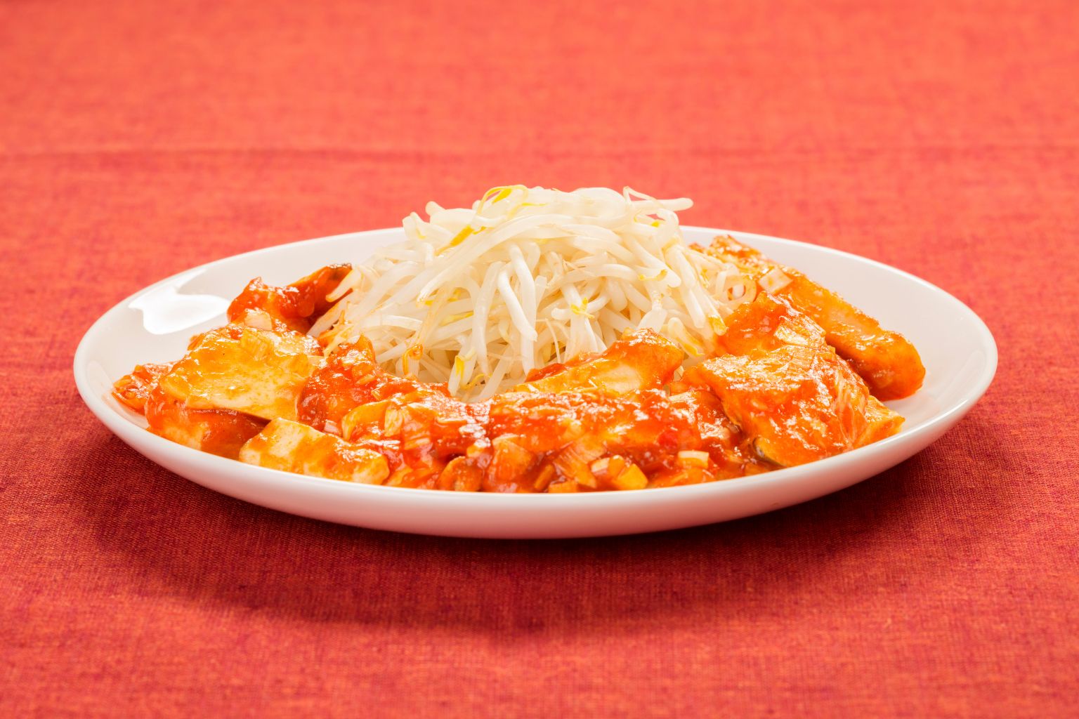 - 皿の中央に「もやしマウンテン」を盛り、その周りにエリンギのチリソースをたっぷりかけたら完成です。